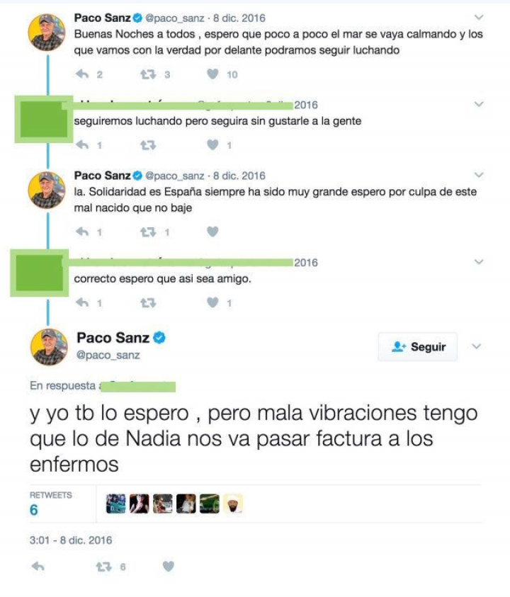 Un usuario le respondía diciendo que esperaba que eso no ocurriese. Sanz, ni corto ni perezoso respondió que tenía "malas vibraciones" y que el Caso Nadia iba a pasarle factura "a los enfermos".