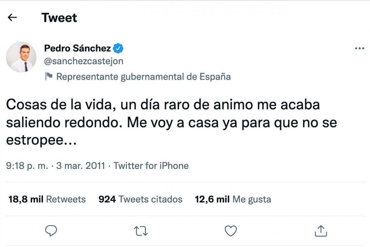Como siempre que ocurre algo importante en este país, las redes sociales han recuperado un tuit de Pedro Sánchez de 2011 que define a la perfección cómo se podría sentir hoy el presidente: “Cosas de la vida, un día raro de animo me acaba saliendo redondo. Me voy a casa ya para que no se estropee”.
