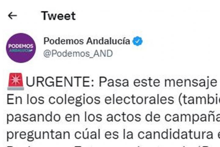 “URGENTE: Pasa este mensaje entre tus contactos. En los colegios electorales (también nos estaba pasando en los actos de campaña) muchas personas preguntan cúal es la candidatura en la que está Podemos. Estamos dentro de ’Por Andalucía”, se lee en el tuit.