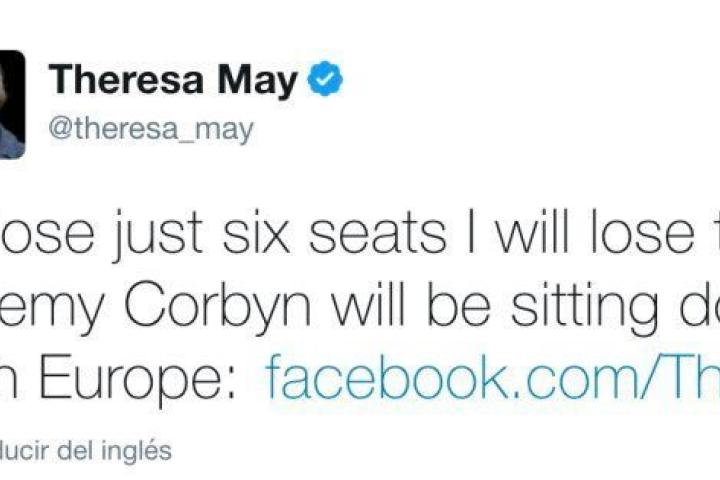 El 20 de mayo pasado, sólo hace unas semanas, la aún primera ministra británica y ganadora de las elecciones de anoche, Theresa May, escribió esto en Twitter: