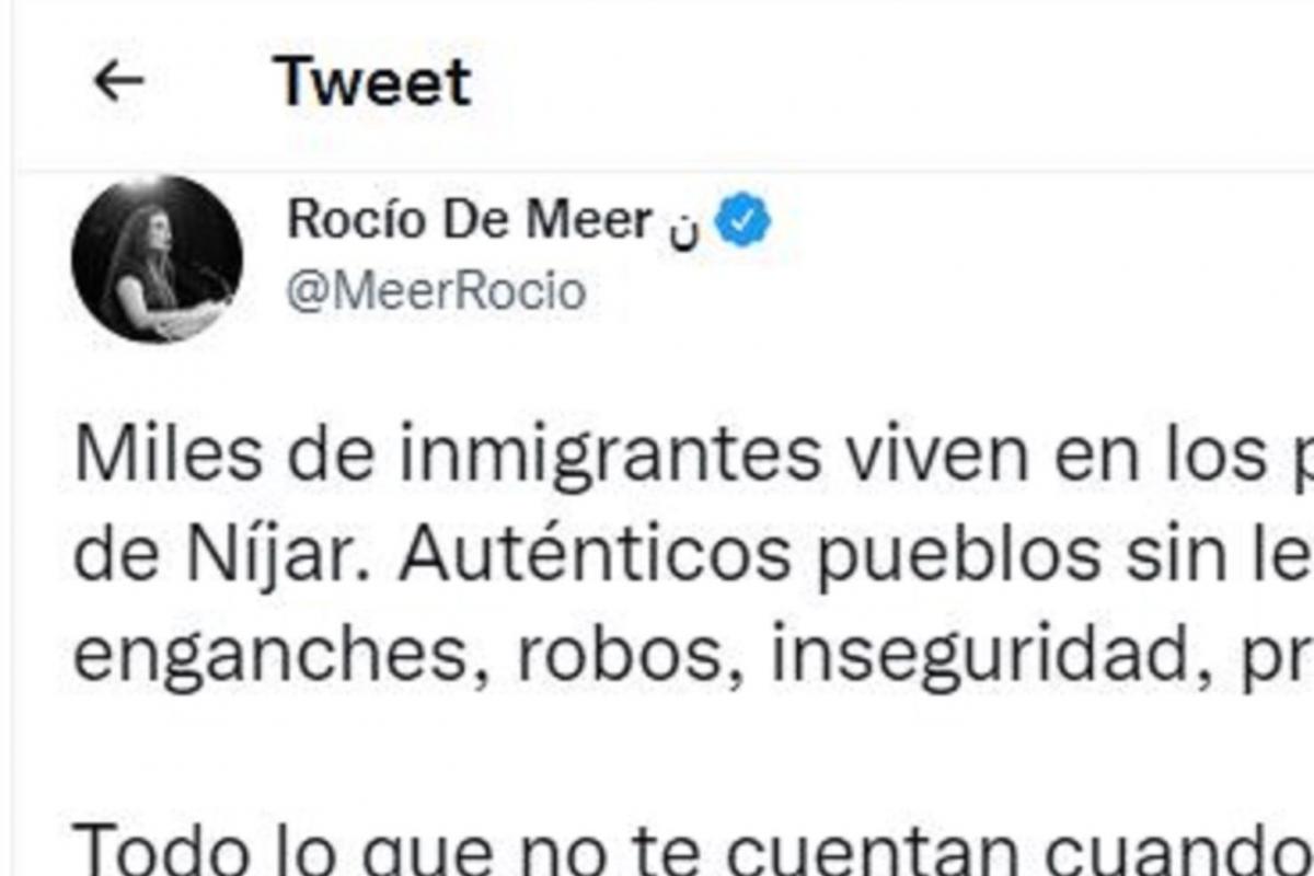 La diputada de Vox Rocío de Meer ha provocado la indignación general en Twitter con un mensaje en el que critica que “miles de inmigrantes viven en los poblados de chabolas de Níjar”.
