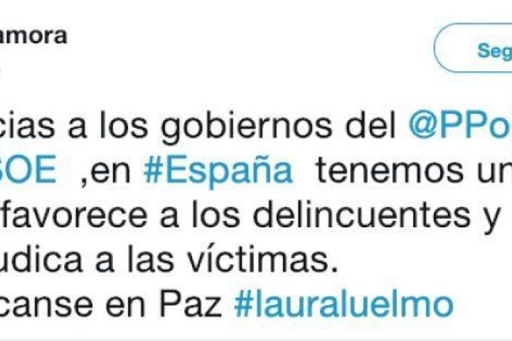 Y, pese a eso, la rama de la formación en Zamora ha lanzado un tuit con el que trata de sacar rédito del asesinato en Huelva de Laura Luelmes, zamorana desplazada a Andalucía como profesora. Desde la cuenta del partido en Twitter, se publicó en la tarde de ayer n mensaje con una fotografía de la fallecida, más la frase: "Gracias a los gobiernos del @PPopular y @PSOE ,en #España tenemos una ley que favorece a los delincuentes y perjudica a las víctimas. Descanse en Paz #lauraluelmo". O sea, con las mujeres asesinadas cuando la ola de dolor está en el máximo, pidiendo cambios penales como la introducción de la prisión permanente revisable, pero denostando de fondo la batalla por la igualdad, por acabar con el miedo de la mitad de la población.