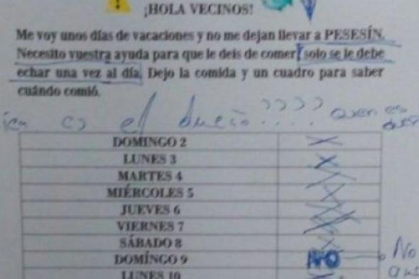Escribió en un nota el hasta ahora dueño de Pesesín: "Me voy unos días de vacaciones y no me dejan llevar a PESESÍN. Necesito vuestra ayuda para que le deis de comer (sólo se le debe echar una vez al día). Dejó la comida y un cuadro para saber cuándo comió".