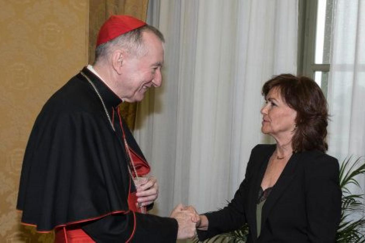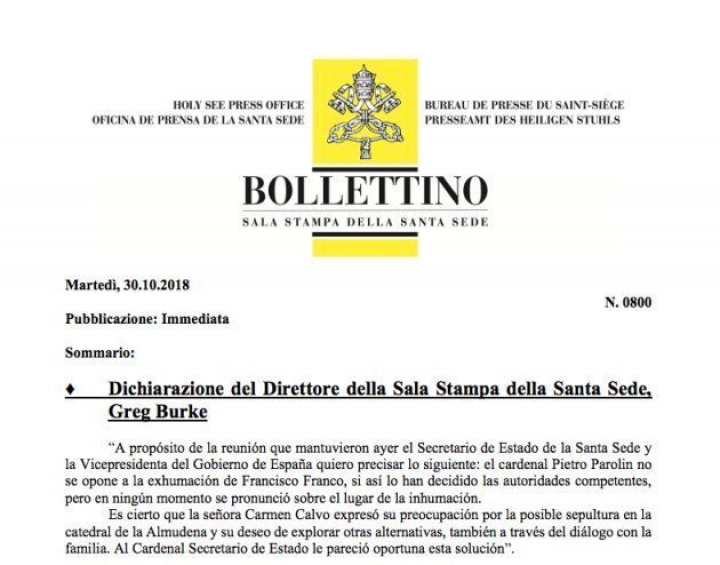 La misma fuente ha indicado en un comunicado que en la reunión que mantuvieron este lunes el secretario de Estado vaticano, el cardenal Pietro Parolin, y la vicepresidenta del Gobierno español, Carmen Calvo, "es cierto" que ella "expresó su preocupación por la posible sepultura en la catedral de la Almudena y su deseo de explorar otras alternativas, también a través del diálogo con la familia".