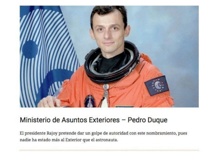 En 2016, después de la victoria de Mariano Rajoy en las elecciones generales, la web satírica ideó una lista ficticia de posibles ministros y en esa enumeración incluyó a Pedro Duque como ministro de Exteriores.