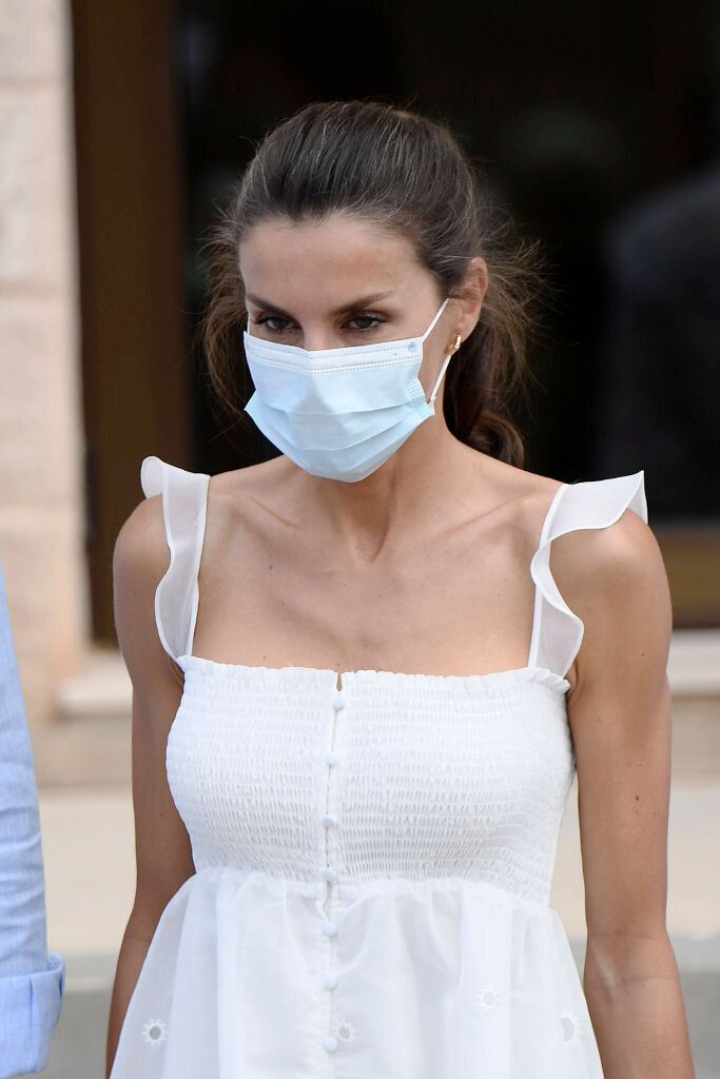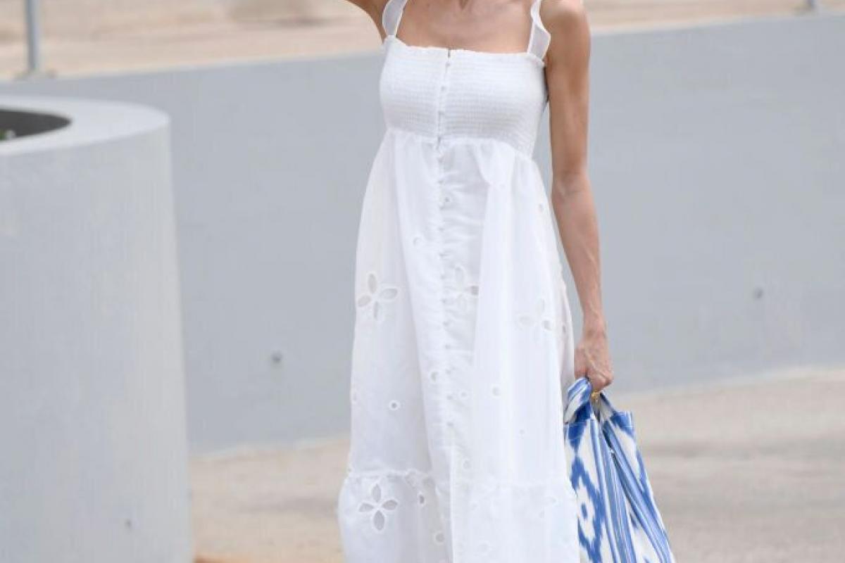 Como ya hizo el martes en la visita al barrio de Son Roca de Palma, la reina ha querido hacer un guiño a la moda ibicenca y ha lucido un vestido blanco midi con bordado de flores y tirantes de volantes. La prenda es de la firma Uterqüe y cuesta 129 euros.