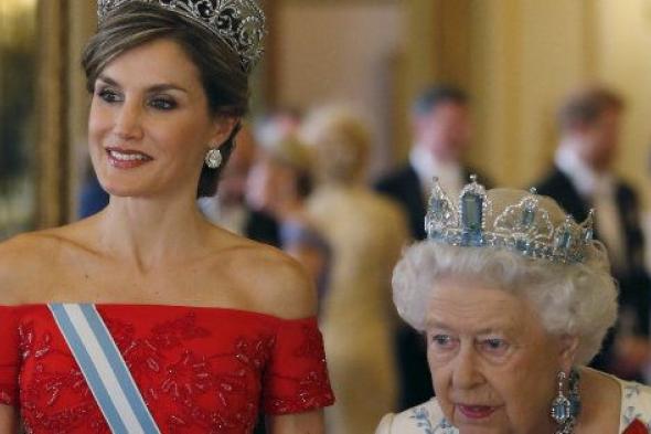 La reina Letizia junto a la reina Isabel II en la cena de gala ofrecida a los reyes de España en el Palacio de Buckingham.POOL New / Reuters