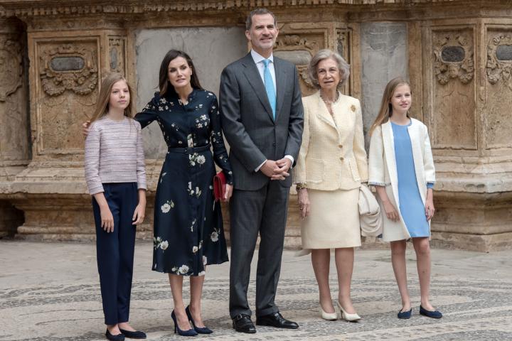 Los reyes Felipe y Letizia, junto a sus hijas y doña Sofía acudieron este domingo a la tradicional misa de Pascua en la catedral de Palma de Mallorca. Al acto únicamente faltó el rey emérito Juan Carlos.