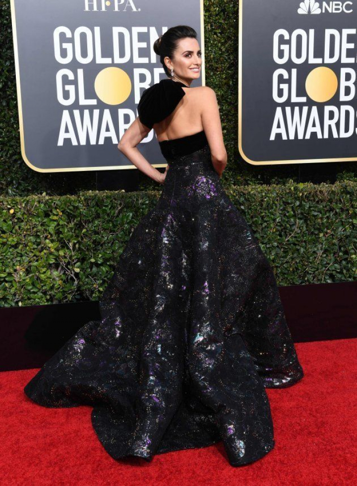 Esta vez, Cruz ha acaparado las miradas por haber apostado por una de las tendencias de la temporada: los lazos. El diseño de fondo negro, con bordados en hilos metalizados de color morado, azul y plata y de inspiración espacial, recuerda por el corte de la falda a los años 50. De parte superior, encorsetada y con escote en forma corazón, parten dos enormes tiras de terciopelo que cierran en el cuello por la parte de atrás con un enorme lazo.