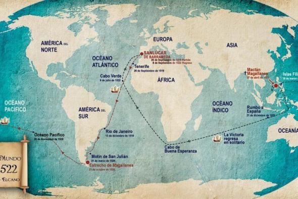 El proyecto estaba encabezado por el portugués Fernando de Magallanes. A su muerte en Filipinas (1521) y tras una serie de conflictos internos, el mando pasó al marino guipuzcoano Juan Sebastián Elcano, quien logró la hazaña de regresar a puerto español. “Esta expedición cambió radicalmente el panorama: consiguió pasar de la teoría a la demostración empírica; la Tierra es redonda. Desde entonces se supo que se puede recorrer todo el planeta por el mar. La aventura fue bastantes pasos más allá de lo hecho por otros navegantes. En comparación, lo de Cristóbal Colón ‘solo’ fue un viaje muy largo”, explica Mazón.