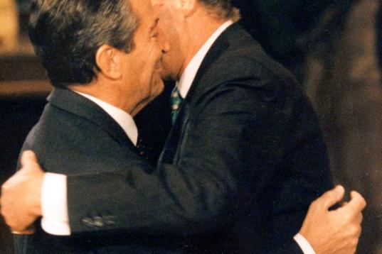 El 25 de octubre de 1977 los partidos políticos del momento firman una serie de acuerdos, fundamentalmente económicos y políticos, conocidos como Pactos de La Moncloa. De izquierda a derecha: Enrique Tierno Galván, Santiago Carrillo, José M...