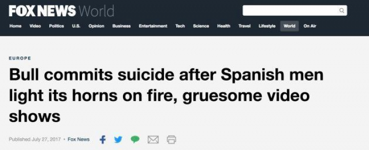 Fox News aseguraba: "Un toro decide suicidarse después de que un hombre le prendiese fuego a los cuernos".