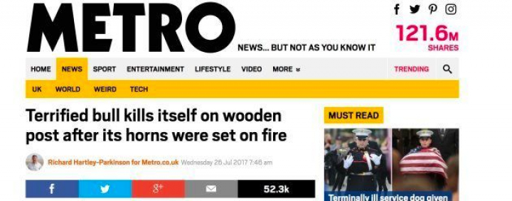 En Metrotitulan: "Un toro atemorizado se mata contra un poste de madera después de que le prendan fuego en los cuernos".