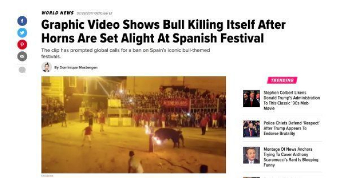 La edición estadounidense de El HuffPost titulaba: "El vídeo que muestra cómo un toro se suicida después de que le prendan fuego a sus cuernos en un festival español".