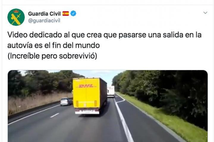 “Vídeo dedicado al que crea que pasarse una salida en la autovía es el fin del mundo (Increíble pero sobrevivió)”, ha escrito la Guardia Civil junto a las imágenes.
