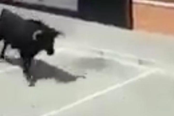 En las imágenes, un toro aparece corriendo a sus anchas por el centro de una localidad de España, destrozando una moto y rozando un coche, mientras una mujer lo graba mientras emite unos sonidos que no han pasado desapercibidos en la red social.