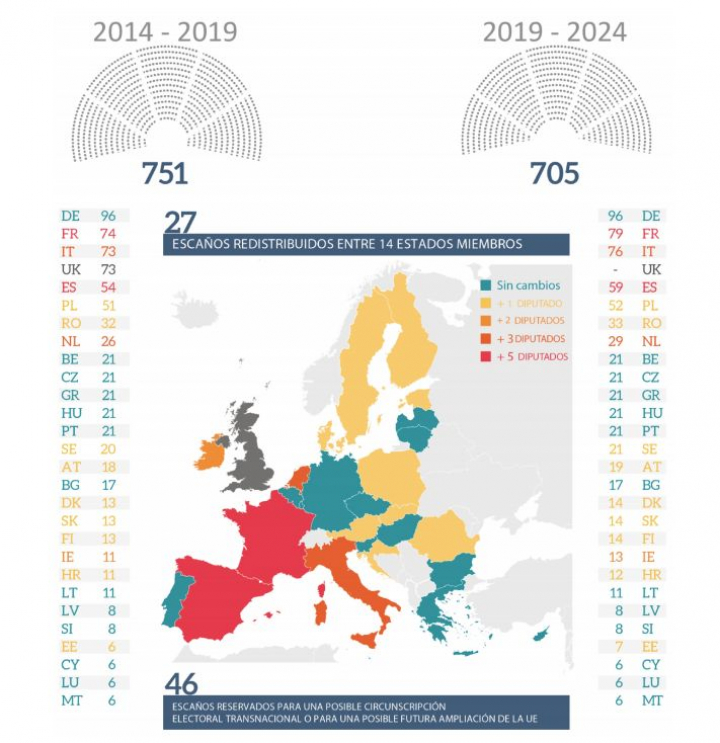 Cuando Reino Unido abandone la UE, el Parlamento Europeo pasará de tener 751 eurodiputados a solo 705 miembros. 27 de esos escaños perdidos se repartirán entre otros países.