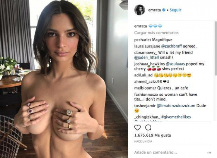La modelo de 26 años lo ha hecho con la máxima discreción posible, pero en su primera aparición en redes sociales tras la boda —que celebraron el pasado 24 de febrero— ha querido mostrar bien su alianza de casada... aunque no sólo eso. En la foto en cuestión, Ratajkowski posa en topless.