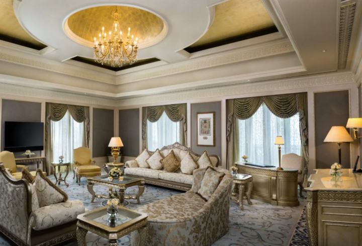 Muchas de las suites están adornadas con oro, mármol y piedras semipreciosoas. Seis de ellas se encuentran en el piso superior del hotel y están reservadas para visitas oficiales a los Emiratos Árabes Unidos de los grandes magnates del planeta y de los miembros de las casas reales del resto del Golfo pérsico y del mundo. Las principales salas también tienen suelo de mármol y cúpulas de oro. Además, el hotel incluye un centro de conferencias de gran tamaño.