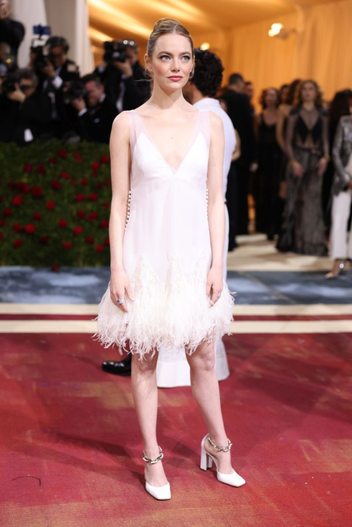 Stone combinó la prenda con unos tacones blancos que se cerraban con una pulsera de eslabones en el tobillo y un anillo con un gran zafiro en el medio. En cuanto al look de belleza, la actriz apostó por un labial en tono rosa y por marcar bien las mejillas con colorete. Stone dejó todo el protagonismo al moño de bailarina que recogía su melena pelirroja.