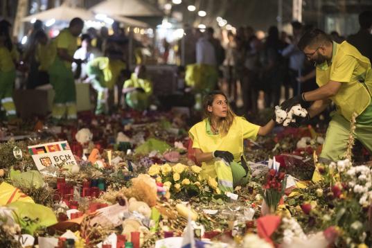 Emoción en la retirada de las ofrendas de La Rambla de Barcelona tras el atentado yihadista