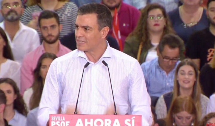 El presidente en funciones sube al estrado en Sevilla. “No puede haber un voto que se pierda en otras formaciones políticas. Quien quiera Gobierno, aquí está el Partido Socialista. Llevamos muchos meses perdiendo el tiempo”.