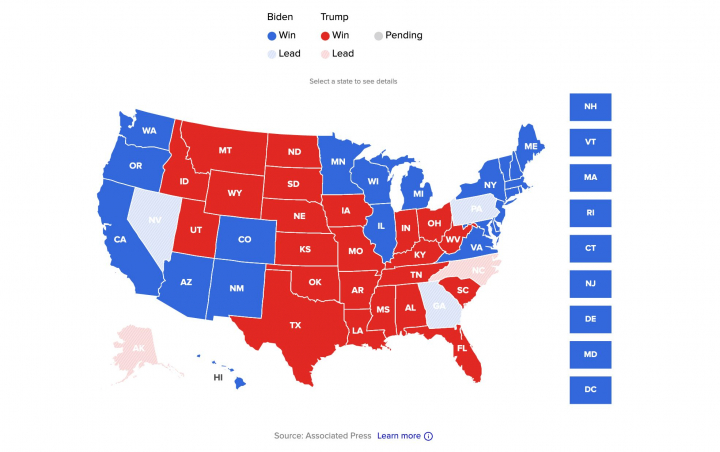 Seguimos estancados en 264 votos electorales para Biden frente a los 214 de Trump. Recordamos que se necesitan 270 para la victoria y todo se dirime en tres estados clave.
