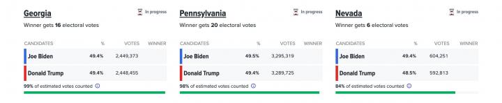 En Georgia, al 99% escrutado, están al borde del empate. Trump solo aventaja allí en 1.700 votos a Biden. Apretadas están también las cosas en Pensilvania, donde al 95% escrutado los separan unos 18.000 votos, con Trump por delante. En Nevada, donde el recuento va más lento (van por el 84%), va ganando Biden por 11.000 votos.
