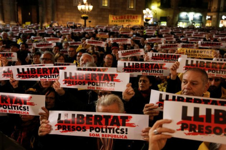 Miles de personas se han concentrado en la plaza Sant Jaume de Barcelona para protestar por la decisión del juez de dejar en prisión al exvicepresidente del Govern Oriol Junqueras, el exconseller de Interior Joaquim Forn, el expresidente de la ANC Jordi Sánchez y el presidente de Òmnium, Jordi Cuixart.