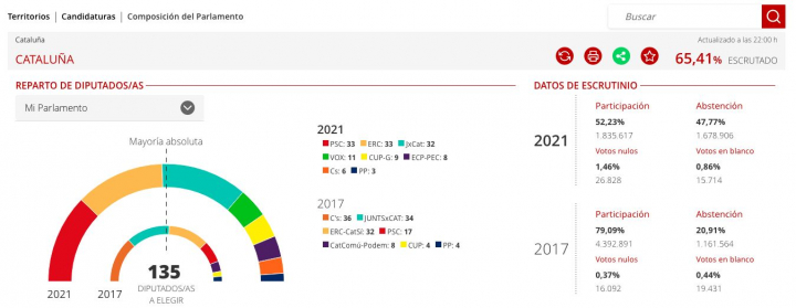 22.03 El recuento pega un tirón, llega al 65%... y sigue el empate