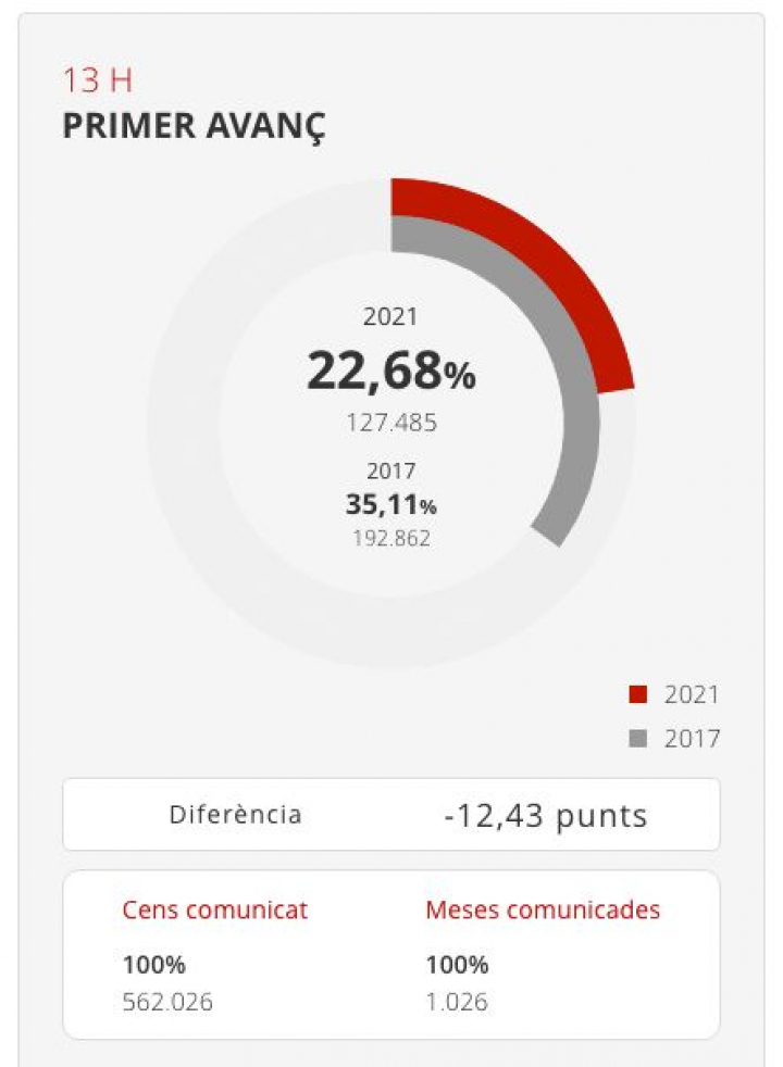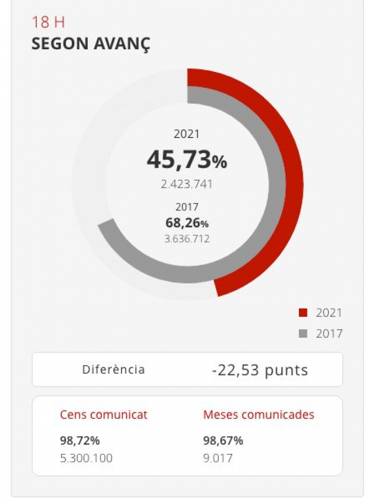 La participación en Cataluña cae más de 22 puntos hasta las 18:00 respecto a 2017. El segundo avance señala una participación del 45,7%, mientras que en 2017 era del 68,26%.