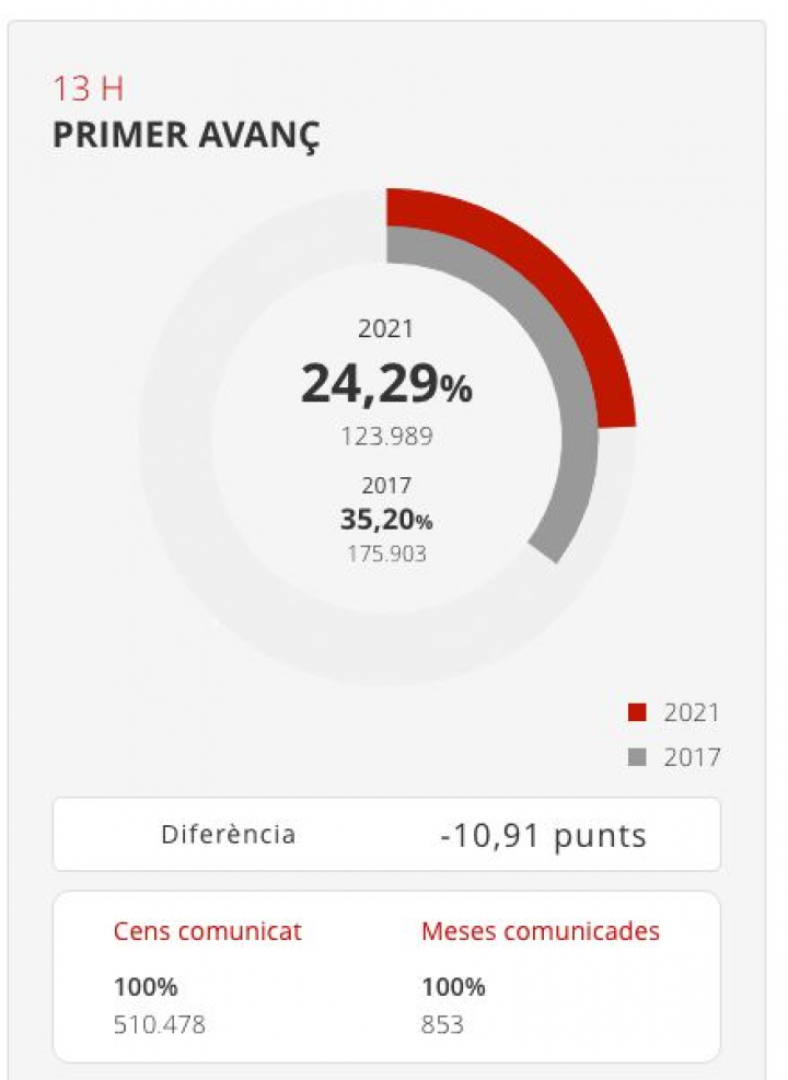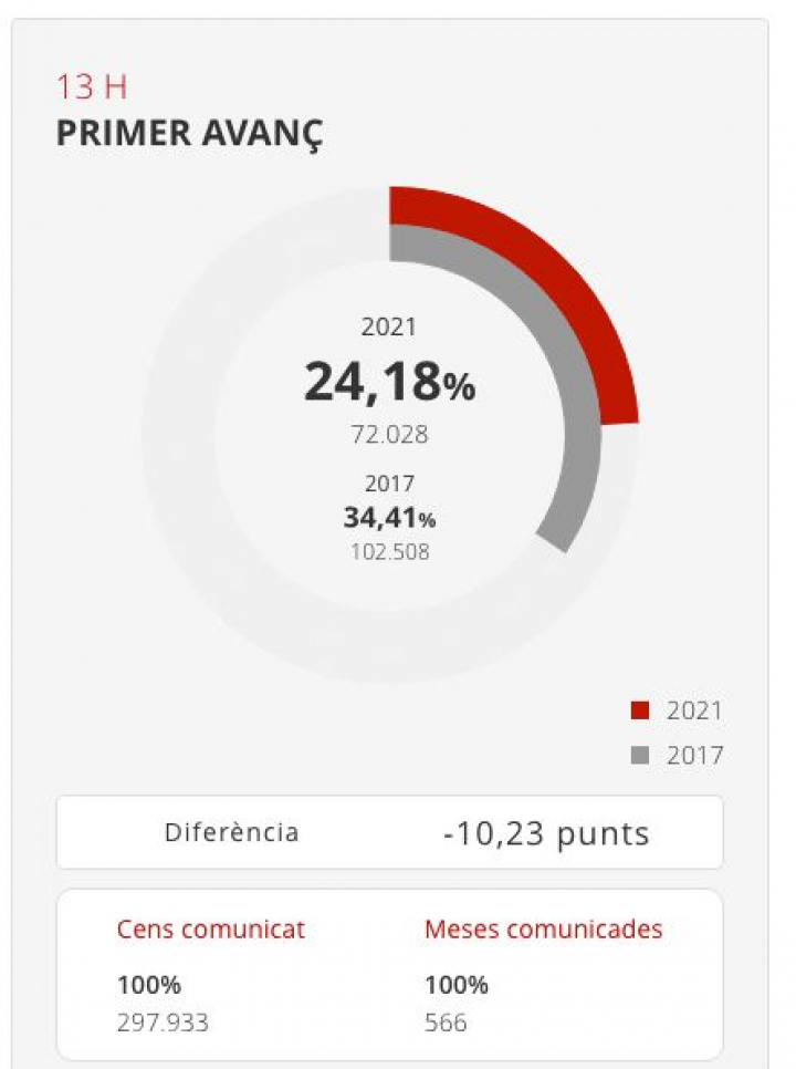 Según datos de la Generalitat, a las 13:00 horas la participación respecto a las elecciones de 2017 ha caído 12 puntos: del 34,69% de hace cuatro años al 22,75% hoy.