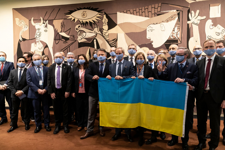 Los embajadores de los países europeos posan en la sede de Naciones Unidas ante la copia del Guernica de Picasso, en Nueva York, tras la reunión del Consejo de Seguridad que no ha servido para nada.