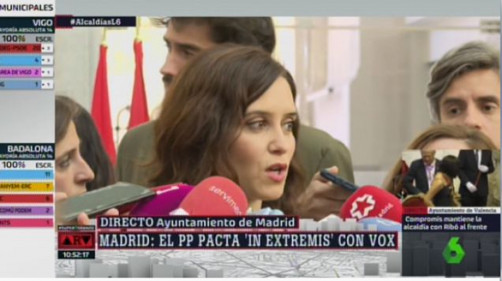 Llega Isabel Díaz Ayuso al Ayuntamiento de Madrid. ”¿Qué le van a dar a Vox?”, le preguntan. “No lo sé”, ha respondido.