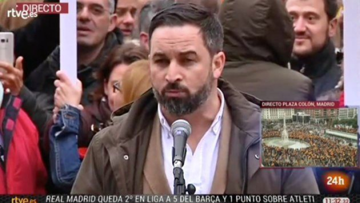 Suben los líderes de los partidos que han convocado la marcha: PP, Ciudadanos y Vox. Y los manifestantes gritan "Santiago presidente", en referencia al líder de la formación de ultraderecha.