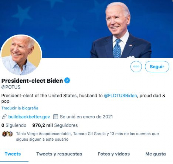Biden, desde su cuenta de Twitter, celebra la salida de Trump de la Casa Blanca.