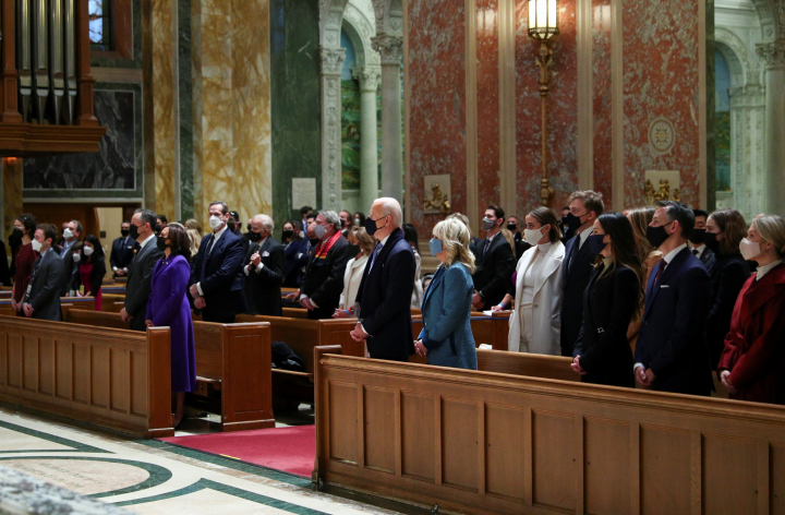 El todavía presidente electo, Joe Biden, su mujer Jill Biden, la futura vicepresidenta Kamala Harris y su marido, Doug Emhoff, asisten a una misa antes de la toma de posesión, en la iglesia católica de San Mateo, en Washington, como manda la tradición. Quedan sólo dos horas para la toma de posesión.