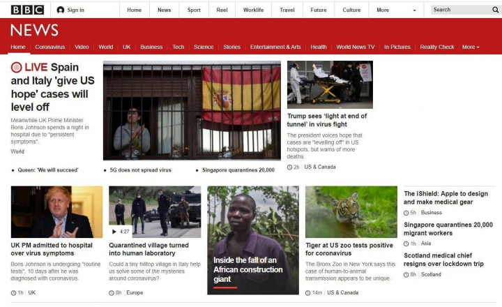 Llevamos unas semanas muy duras y eso ha hecho que España ocupe las aperturas de las principales webs del mundo como son la BBC o la CNN. Este lunes, ha vuelto a pasar, pero por una buena noticia: “Los casos de España e Italia dan esperanza”, reza el titular que abre la página de la cadena pública británica.