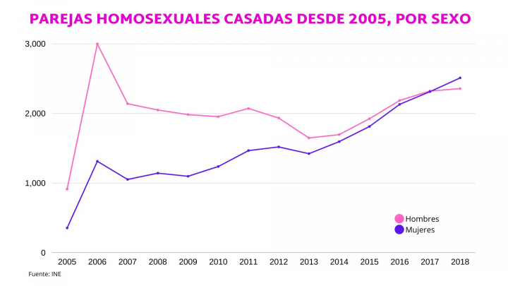 En España, los primeros en casarse fueron Carlos y Emilio, que contrajeron matrimonio en Madrid después de 35 años juntos el mismo 3 de julio, cuando entró en vigor la ley. Después de ellos han venido muchos más. Desde 2005 a 2018 se casaron en España 49.168 parejas del mismo sexo, según el Instituto Nacional de Estadística (INE). De ellos, 28.192 fueron matrimonios entre hombres y 20.976, entre mujeres.