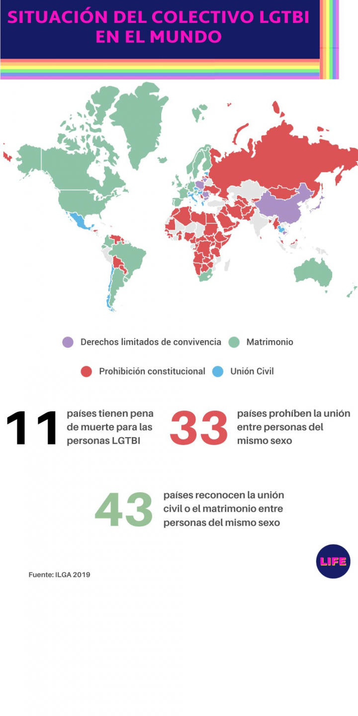 Más allá de la desigualdad ante el Registro Civil que existe en España, la unión de personas del mismo sexo sigue prohibida en 33 países y en 11 de ellos se mantiene la pena de muerte a las personas LGTBI, según datos de la Asociación Internacional de Lesbianas, Gays, Bisexuales, Trans e Intersex (ILGA 2019). Los países que condenan la homosexualidad con pena de muerte —generalmente con lapidación— son Arabia Saudí, Irán, Yemen, Sudán, algunos Estados de Nigeria y parte de Somalia. La condena de muerte a las personas con “conductas” homosexuales también se extiende a otros países como Mauritania, Emiratos Árabes Unidos, Catar, Pakistán y Afganistán.