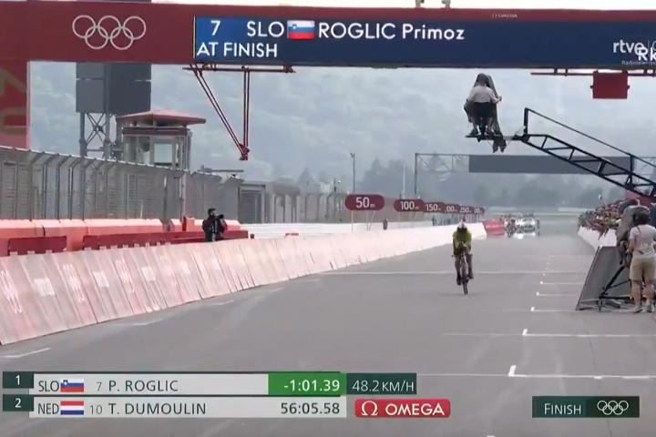 Primoz Roglic ha logrado el oro este miércoles en la prueba de ciclismo contrarreloj en Tokio 2020 y ha dejado una imagen de lo más llamativa a su llegada a la línea de meta.