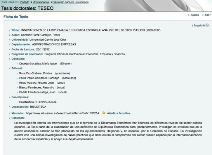 En esta ficha se recoge que la tesis se titula Innovaciones de la diplomacia económica española: Análisis del sector público (2000-2012). Como autor consta Pedro Sánchez Pérez-Castejón y la universidad es la Camilo José Cela. La fecha de lectura fue el 26 de noviembre de 2012.
