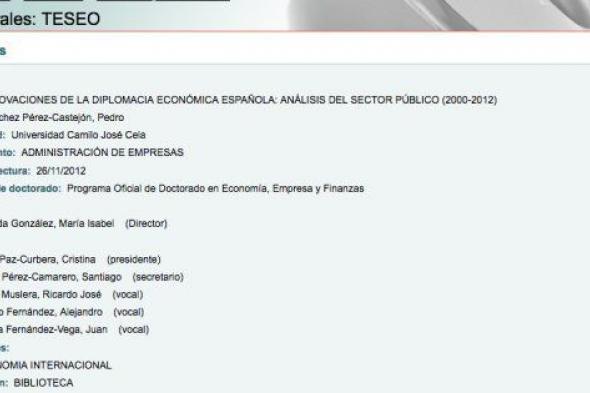 En esta ficha se recoge que la tesis se titula Innovaciones de la diplomacia económica española: Análisis del sector público (2000-2012). Como autor consta Pedro Sánchez Pérez-Castejón y la universidad es la Camilo José Cela. La fecha de lectura fue el 26 de noviembre de 2012.