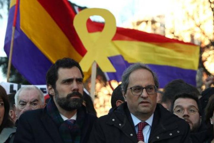 Un grito de 'fascista' se ha escuchado al llegar el presidente de la Generalitat, Quim Torra. Ha accedido por la puerta principal y no ha querido dirigirse a la prensa. Minutos antes había estado en la cercana concentración en Recoletos -se han prohibido manifestaciones frente al tribunal- junto al presidente del Parlament, Roger Torrent. "Decidir no es delito", decía la pancarta trasera. Dentro del Supremo, Torra, ha saludado en su despacho al presidente del Tribunal y del CGPJ, Carlos Lesmes.
