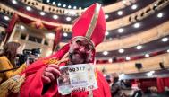 El conocido como 'Mocito Feliz' (d), junto a otras personas disfrazadas, espera en el interior del Teatro Real