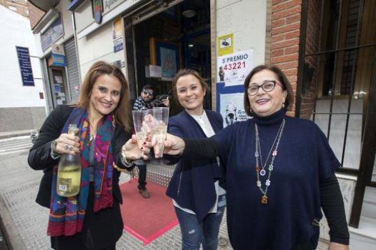 La propietaria de la administración de loteria nº41 de Murcia, 'La Peli', María Peligros Ríos (d), acompañada por sus hijas Carmen y María Dolores, celebran con cava que han repartido 60.000 euros del quinto premio.
