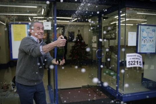 El dueño de la administración de lotería de la calle Orense,50, en Madrid, celebra la venta de número 52215, cuarto premio del sorteo extraordinario de la Loteria de Navidad.