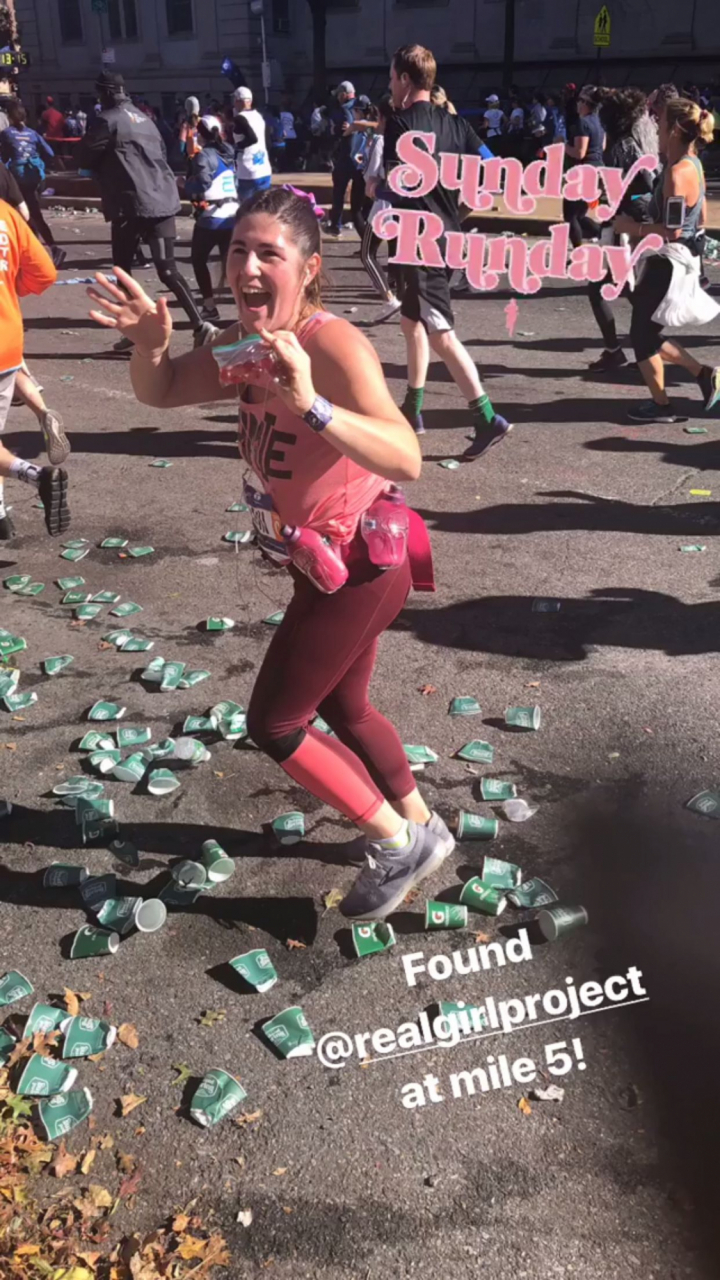 Cuando las piernas se me empezaron a agarrotar en el kilómetro 23 y no paré, pensé durante un buen tramo que no iba a conseguirlo y empecé a cuestionarme por qué había decidido apuntarme. Pero veía a amigos y familiares animándome por toda la ciudad como auténticos campeones y me recargaron las pilas. Mi amigo y entrenador encargó que me hicieran este increíble dibujo y corrió conmigo cuando me encontraba al borde de las lágrimas, me frotó crema para los doloridos músculos de mis piernas y me volvió a asegurar que podía hacerlo. Sonreí todo el trayecto sin importar cómo me sentía. Me servía de ayuda.