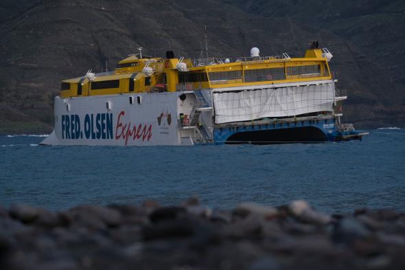 Anoche, una súbita racha de viento empujó al ferry Bentago Express contra una baja próxima al puerto de Las Nieves, mientras realizaba su maniobra de atraque en su último servicio del día entre Tenerife y Gran Canaria.