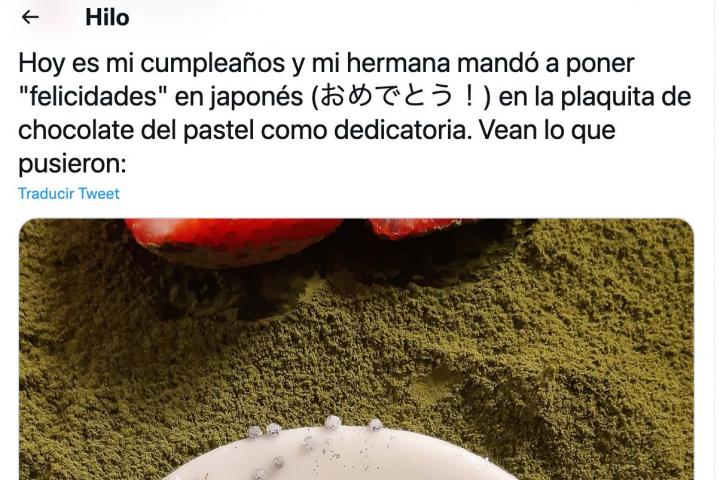 “Hoy es mi cumpleaños y mi hermana mandó a poner “felicidades” en japonés (おめでとう!) en la plaquita de chocolate del pastel como dedicatoria. Vean lo que pusieron”, ha escrito el cumpleañero en su perfil de Twitter junto a una foto del mensaje.
